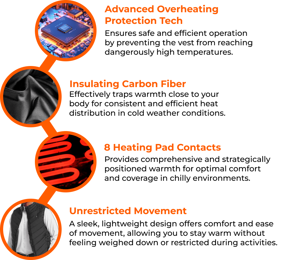 Built-in heating pads heat up in just 3 seconds, enveloping your entire body in warmth for maximum coverage and comfort.